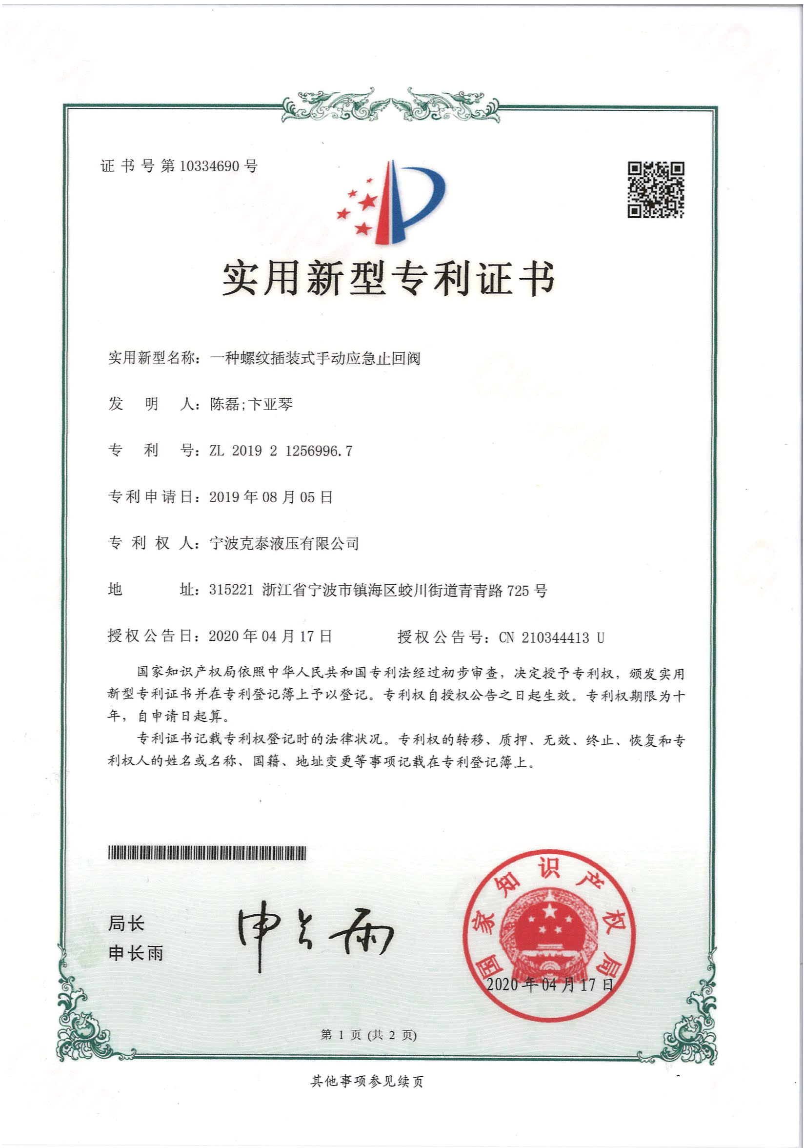 一种螺纹插装式手动应急止回阀实用新型专利