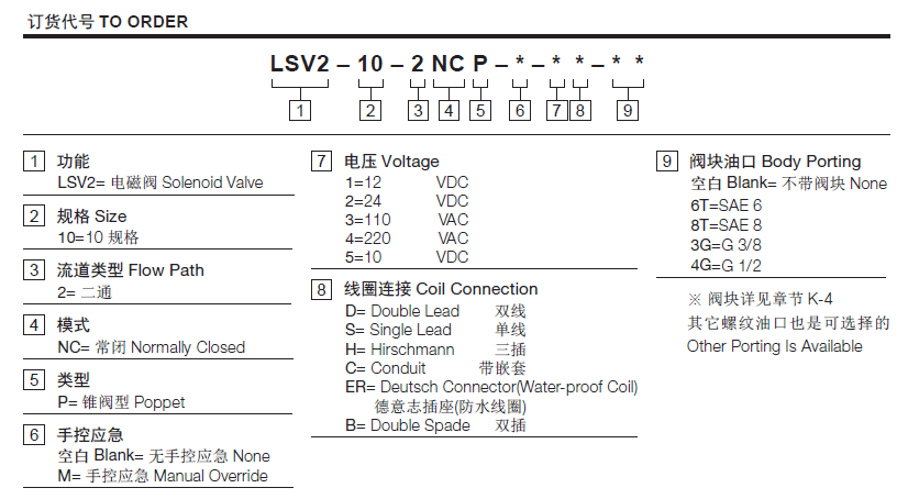 流量请查看《压力-流量曲线图》插孔10-2过滤参考《油液清洁度》最大工作压力207Bar内泄漏3 drops/min.(滴/分)max. at 207bar温度-40°F to +212°F(-40°C to +100°C)线圈额定负载Continuous from 85% to 115% of nominal voltage(连续工作电压)油液Mineral-based fluids with viscosities of 7.4 to 420 cSt.(矿物油粘度)阀块材料6061-T6铝,允许使用最大压力207bar 钢和球铁允许使用最大压力350bar