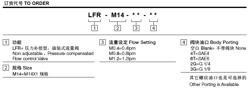 工作压力420bar流量请查看《压力-流量曲线图》插孔Rexroth-R/DBD.4k过滤参考《油液清洁度》流量设定0.4-0.8-1.2 l/min.流量控制精度±15%温度-40ºF to +250ºF(-40ºC to +120ºC)油液Mineral-based fluids with viscosities of 7.4 to 420 cSt.(矿物油粘度)阀块材料钢和球铁允许使用最大压力350bar -