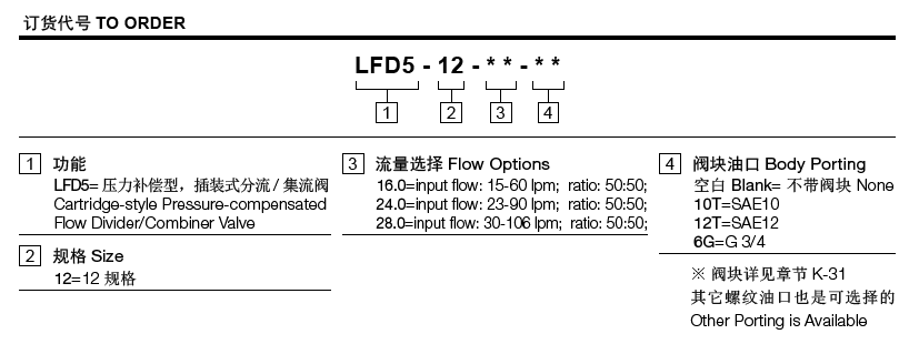 工作压力345bar流量请查看《压力-流量曲线图》插孔12-4过滤参考《油液清洁度》流量选项input flow: 15-60 lpm; ratio:50:50; model: LFD5-12-16.0