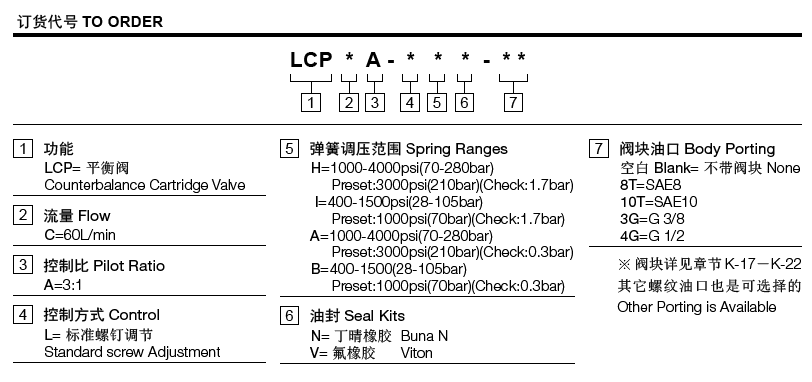 工作压力280bar流量请查看《压力-流量曲线图》插孔SUN T-11A过滤参考《油液清洁度》最大负载215bar内泄漏5 drops/min.(滴/分)控制比3:1温度-40ºF to +250ºF(-40ºC to +120ºC)油液Mineral-based fluids with viscosities of 7.4 to 420 cSt.(矿物油粘度)阀块材料6061-T6铝,允许使用最大压力207bar 钢和球铁允许使用最大压力350bar -