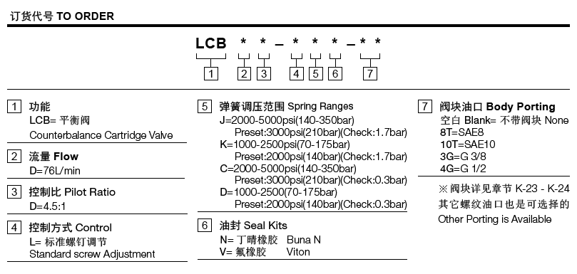 工作压力350bar流量请查看《压力-流量曲线图》插孔SUN T-2A过滤参考《油液清洁度》最大负载270bar内泄漏5 drops/min.(滴/分)控制比4.5:1温度-40ºF to +250ºF(-40ºC to +120ºC)油液Mineral-based fluids with viscosities of 7.4 to 420 cSt.(矿物油粘度)阀块材料6061-T6铝,允许使用最大压力207bar 钢和球铁允许使用最大压力350bar -