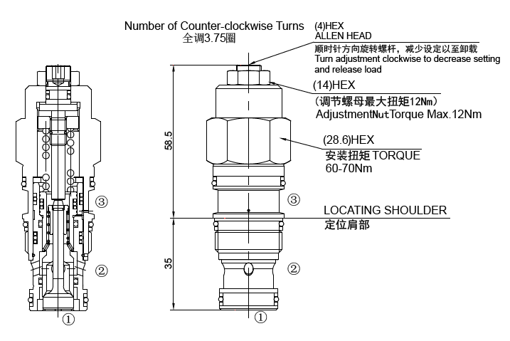 ②口的背压按“控制比 +1”的倍数加到溢流阀的设定值上即增加值 =(1+ 控制比)×压力值。