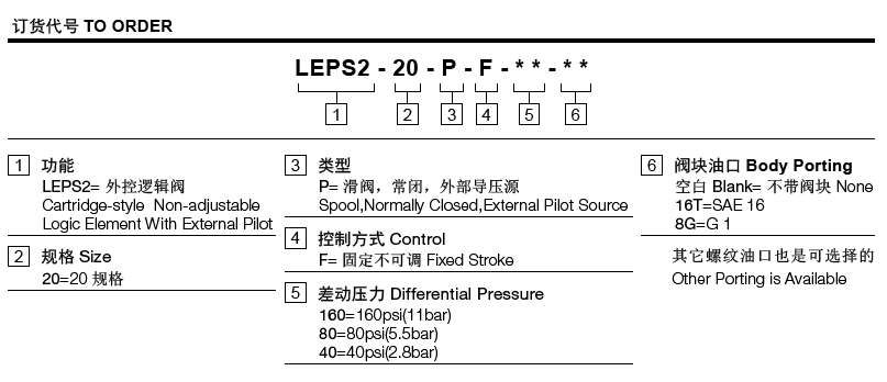工作压力290bar流量请查看《压力-流量曲线图》插孔20-S3过滤参考《油液清洁度》内泄漏82 ml/min. max. at 290 bar温度-40ºF to +250ºF(-40ºC to +120ºC)油液Mineral-based fluids with viscosities of 7.4 to 420 cSt.(矿物油粘度)阀块材料钢和球铁允许使用最大压力350bar -