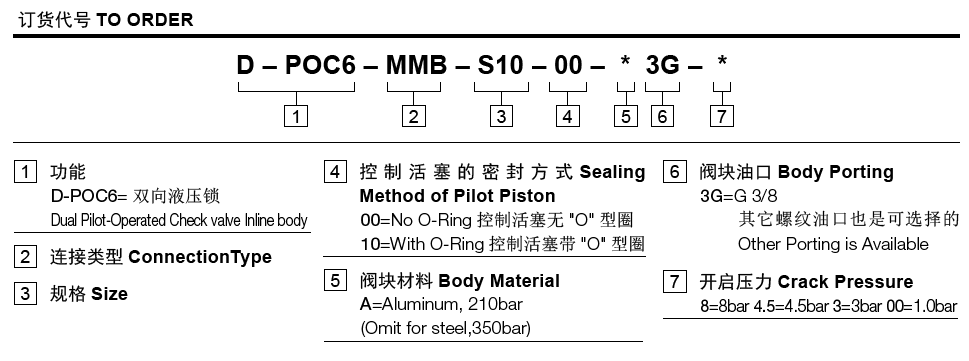 工作压力350bar流量请查看《压力-流量曲线图》过滤参考《油液清洁度》单向阀开启压力00=1.0bar; 8=8bar; 4.5=4.5bar; 3=3bar内泄漏2 drops/min(滴/分). max. at 350 bar控制比7:1温度-40°F to +250°F(-40°C to +120°C)油液Mineral-based fluids with viscosities of 7.4 to 420 cSt.(矿物油粘度)阀块材料钢和球铁允许使用最大压力350bar -