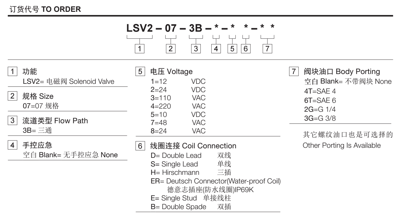 工作压力207bar流量请查看《压力-流量曲线图》插孔07-3过滤参考《油液清洁度》内泄漏82cc/min.(毫升/分)max.at 207bar温度-40ºF to +250ºF(-40ºC to +120ºC)线圈额定负载Continuous from 85% to 115% of nominal voltage(连续工作电压)油液Mineral-based fluids with viscosities of 7.4 to 420 cSt.(矿物油粘度)阀块材料6061-T6铝,允许使用最大压力207bar,钢和球铁允许使用最大压力350bar -