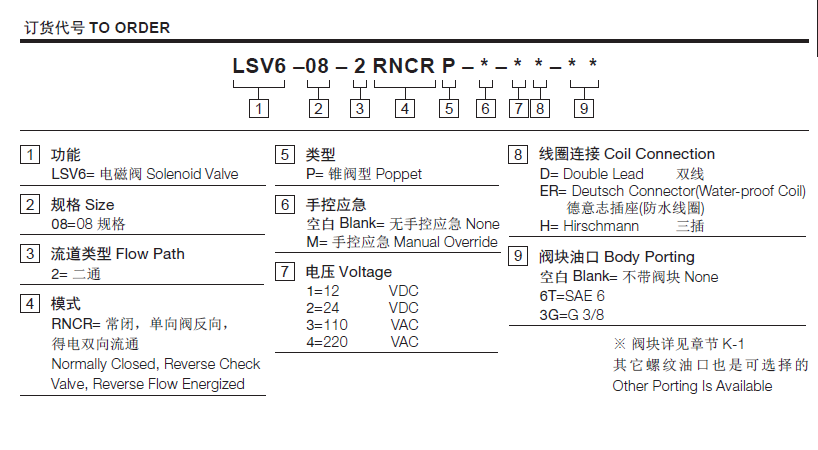 流量请查看《压力-流量曲线图》插孔08-2过滤参考《油液清洁度》最大工作压力350Bar内泄漏3 drops/min.(滴/分) max. at 350bar温度-40°F to +212°F(-40°C to +100°C)线圈额定负载Continuous from 85% to 115% of nominal voltage(连续工作电压)油液Mineral-based fluids with viscosities of 7.4 to 420 cSt.(矿物油粘度)阀块材料钢和球铁允许使用最大压力350bar -